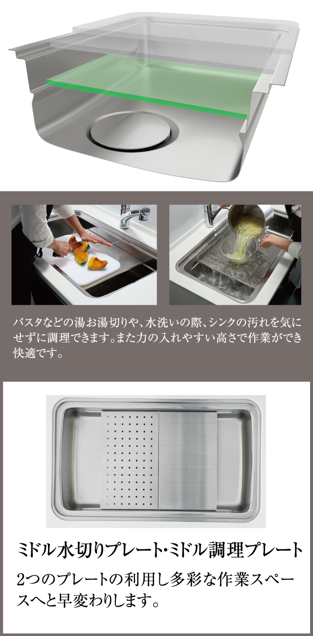 シンクを3つの層で立体的に使用できる多層設計を採用。「洗う」+「調理する」+「片付ける」をより効率的で快適なスペースを実現しました。