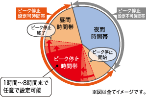 電力量料金単価の高い時間帯や、実量制の電力契約などで消費電力のピークを抑えたい時間帯に、エコキュートのわき上げを停止することが出来ます。※1昼間時間帯の中で、1時間~最大8時間まで設定が可能(1時間刻み)。開始時刻と終了時刻を選択する事でピーク停止時間を決定します。